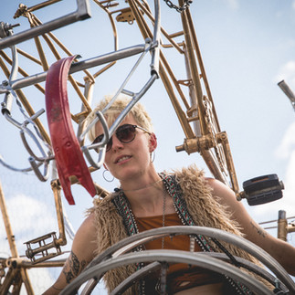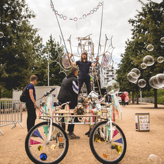 >>> La scénographie reprend des éléments des différentes inspirations mentionnées ci-dessus. Plus précisément, ces éléments de décors figuratifs sont composés d’engrenages réalisés à partir de différentes pièces de vélo (roues, chaînes, pédalier, dérailleurs, potences et cadres) et autres ferrailles capables de produire de la lumière grâce à des dynamos. Ces mêmes pièces seront également retravaillées, décorées, peintes, pailletées, afin d’être intégrées à la structure du char. Ce métal inerte, voué à la destruction, devient alors chimère mécanique...